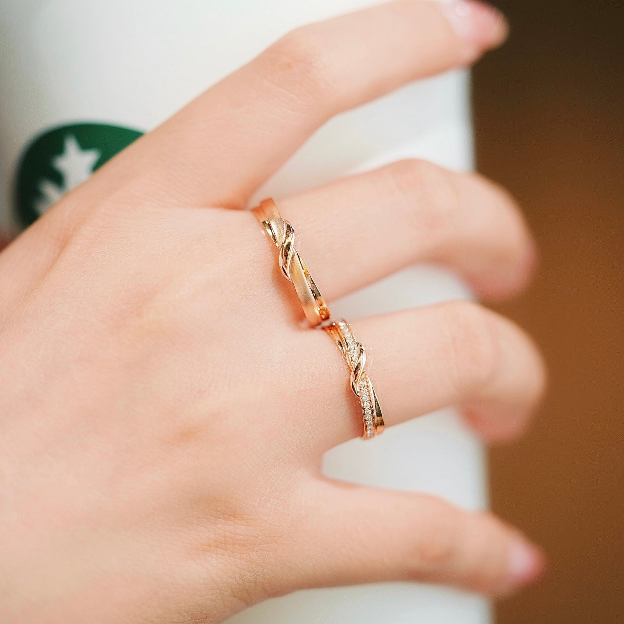 This 18K diamond couple ring is a symbol of everlasting love. Its intertwining design represents the union of two souls, bringing endless happiness. The delicate and clever design of the women's ring adds a touch of sophistication, while the men's ring combines a matte and polished finish for a luxurious feel.