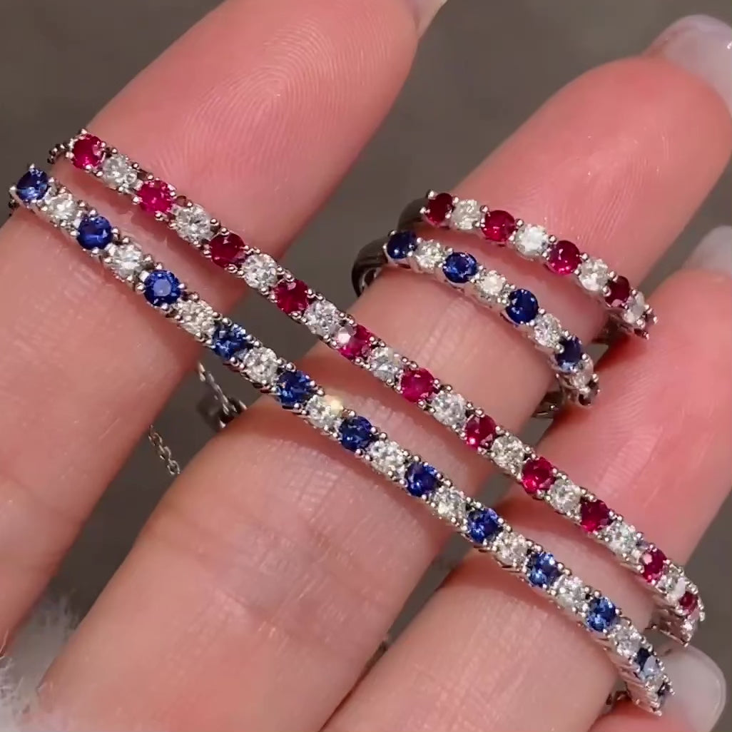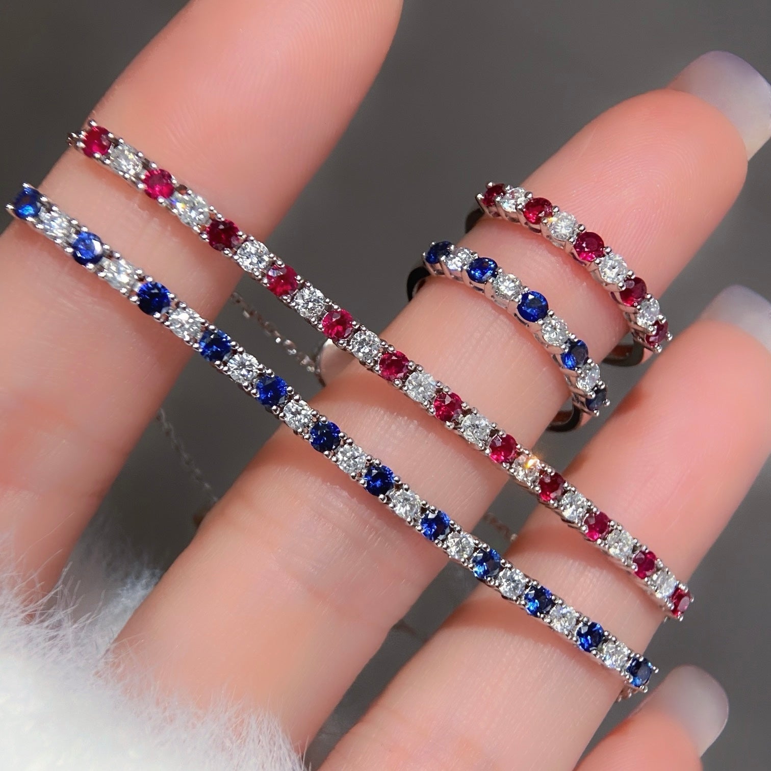 Elegant and sophisticated, these 18K white gold bracelets and rings feature natural ruby or sapphire stones surrounded by sparkling diamonds. The vibrant red of the rubies and the royal blue of the sapphires add a touch of luxury to any outfit. Perfect for everyday wear or special occasions.